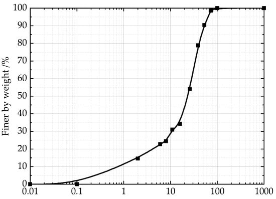 The test soil sample is collected from the high fill project in the new campus of Yan’an University, Yan’an City, Shaanxi Province. The soil sample is mainly composed of silt, containing a small amount of silty clay, which belongs to Q3 loess (also known as “Malan Loess”) [35]. Basic geotechnical tests were conducted to obtain the basic properties of the soil samples. Table 1 shows the resulting physical and mechanical properties. The grading curve is shown in Figure 2. According to the Unified Soil Classification System (USCS), the sampled soil was classified as lean silt (ML). Based on X-ray diffraction analysis according to test standard (GB/T 50123) [36], the chemical composition of the sampled soil was obtained. The content of SiO2 ranged from 50 to 60%, Al2O3 ranged from 9 to 12%, CaO ranged from 7 to 10%, MgO ranged from 1 to 3%, Fe2O3 ranged from 4 to 5%, and K2O ranged from 2%. The mineral composition is mainly composed of quartz, feldspar, and carbonate minerals. Through a laboratory compaction test, the optimal water content and maximum dry density of soil samples were obtained as 13.50% and 1.785 g/cm3, respectively. In the tests of the present study, samples with different water content were prepared by water film transfer method [37] for humidification and placed in a moisturizing cylinder for 48 hours before use [38].