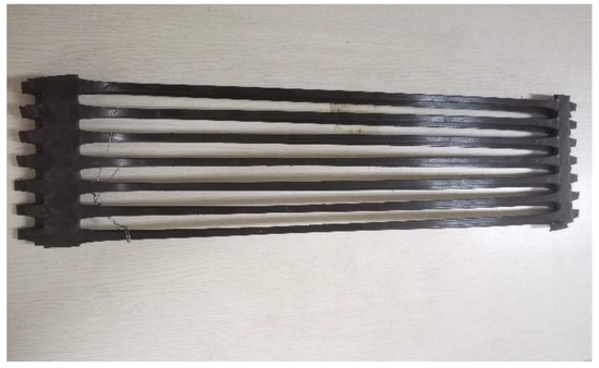 High density polyethylene (HDPE) one-way geogrid is used in the test, as shown in Figure 3. The width of the transverse rib and the width of the longitudinal rib of the geogrid are 19 mm and 5 mm, respectively. The thickness of the transverse rib and the thickness of the longitudinal rib are 3.3 mm and 1 mm, respectively. The peak strain is 11.28%. Other basic mechanical properties are shown in Table 2. The single geogrid used in the test is cut from the unidirectional geogrid sample, and the actual length of the single geogrid is determined by the specimen mold.