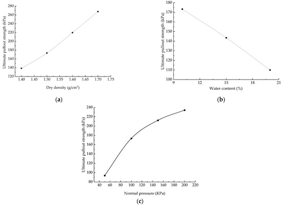Ultimate pullout stress. (a) Dry density, (b) water content, (c) normal pressure.