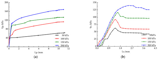L-τ curve of pullout tests and direct shear tests. (a) Pullout test results, (b) direct shear test results.