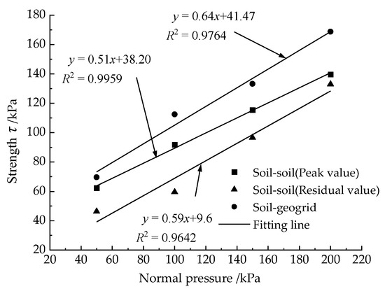 It can be seen from Figure 5 that the pullout force of the reinforced soil interface increases nonlinearly with the increase of the horizontal displacement. With the increase of normal pressure, the pullout force required under the same horizontal displacement of the soil–geogrid interface gradually increases. Under all normal pressure, the relationship curve of shear stress and shear displacement of direct shear test show a strain softening pattern. The greater the normal pressure applied, the greater the shear displacement needed for a given peak shear stress. Both peak values and residual values of the results of direct shear tests were recorded and their relations with normal pressure are shown in Figure 6. On the other hand, the displacement–stress curves of the pullout tests were of the strain-hardening type. The relationship between pullout strength and normal pressure is also shown in Figure 6. The cohesion and internal friction angle of loess through direct shear test are 38.20 kPa and 27.14°, respectively, for peak strength, and for the residual strength, the indexes are 9.6 kPa and 30.6°, respectively. As for the pullout strength of the interface of compacted loess and geogrid, the cohesion is 41.47 kPa, and the internal friction angle is 32.44°. It is clear that the internal friction angle of the four test results is similar while cohesion varied greatly. The internal friction angle of the residual strength is closer to pullout strength. This is because the residual strength can better reflect the frictional behavior of the soil.