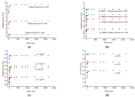 Shear displacement and time creep curve of reinforced soil interface. (a) Influence of pullout loading levels, (b) influence of normal pressure, (c) influence of dry density, (d) influence of water content.