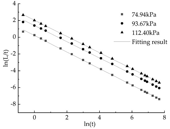 To predict the creep behavior of the interface of compacted loess and geogrid based on acquired deformation data, a R-Q-λ three-parameter empirical model was introduced. A fitting analysis was conducted on the test results. Based on the creep test data with normal pressure, dry density, and water content at 100 kPa, 1.5 g/cm3, and 10%, respectively, the hyperbolic relationship of ln(L/t)−ln(t) was established. It can be seen from Figure 8 that at any tension level, ln(L/t)−ln(t) shows a good linear relationship, which can be expressed as follows: