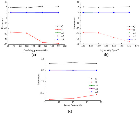 where Q, R, and λ are all the fitting parameters. The results of the above test parameters are as follows: λ is in the range (0.0137, 0.0334), Q = 4.5312, R = −19.2911. Using this three-parameter model, the fitting parameters for the test results under different influencing factors are calculated through fitting analysis. Influence of the normal pressure, dry density, and water content on the model parameters are shown in Figure 10.