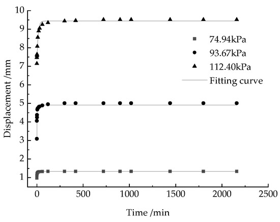 where L(t) is the creep displacement value of the interface at arbitrary time. τ0 is the pullout load. E0 is the elastic coefficient of the Hooke model. E1 and η1 are the elastic coefficient and viscosity coefficient of the Kelvin model, respectively. Using data analysis software Origin, fitting analysis was carried out for all test data. Fitting results for the conditions of normal pressure at 100 kPa, dry density at 1.5 g/cm3, and water content at 10% is shown in Figure 11. The correlation coefficient of the model fitting is above 0.98, indicating that the element model can better describe the creep property of the interface of compacted loess and geogrid.