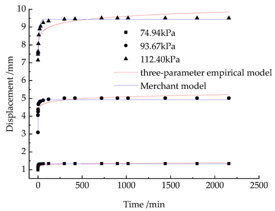 According to the comparison analysis, it can be concluded that both the three-parameter empirical model and the Merchant model are capable of reflecting the creep behavior of the interface of compacted loess and geogrid. The Merchant model is more accurate in the early stage of the creep deformation, while the three-parameter empirical model is more suitable for predicting the long-term creep deformation of the interface of compacted loess and geogrid.