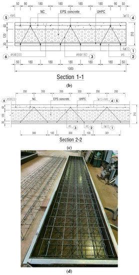 Concerning the idea of combining lightweightness and high tensile performance of precast plank, an innovative reinforced concrete-ultra high-performance concrete (RC–UHPC) slab with expanded polystyrene (EPS) lightweight concrete core (so-called RC–UHPC composite slab) is proposed to serve the semi-precast solution. For this type of composite slab, the bottom layer of ultra-high-performance concrete (UHPC) with an inclined steel truss bars system works as a formwork during the construction of a semi-precast slab, the EPS lightweight concrete layer is used for the reduction of structure self-weight, and the top layer is normal concrete designed to withstand compressive stress when the slab is loaded. UHPC has high compressive (up to 150 MPa) and especially tensile strengths (up to 15 MPa), which are much higher than normal concrete. The high density and compactness of the UHPC matrix lead to great physical performance as low permeability can restrain the access of negative substances, leading to enhanced durability [20,21]. UHPC also exhibits other outstanding characteristics including high energy dissipation, fracture energy (up to 40 kJ/m2), and ductility [22]. An additional interesting characteristic is the strain-hardening performance of UHPC in tension owing to the presence of steel fibers [23]. Considering the excellent physical and mechanical performance of UHPC, this material is used for the proposed RC–UHPC composite slab, as several previous studies have successfully implemented [24,25]. For the lightweight infill material of the slab, expanded polystyrene (EPS) lightweight concrete that has been utilized for several decades to reduce the structural weight is adopted. Besides reducing the structure’s self-weight, EPS concrete also revealed good functional uses such as sound and thermal insulation [26].