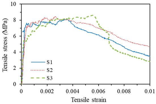 The mechanical properties of concrete materials were determined from the test results of specimens according to ASTM standards after 28-day curing age. For compressive strength of each concrete type, three cylindrical specimens with the size of 100 mm × 200 mm were prepared and tested according to ASTM C39M [27], while three cylindrical specimens with the same size were prepared and tested according to ASTM C469M [28] for the elastic modulus. The compressive strength and elastic modulus of each concrete type were taken as the average value of three values from the corresponding tests. As a result, the UHPC has a compressive strength of fck,UHPC = 123.7 MPa and an elastic modulus of EUHPC = 42.5 GPa; the NC has a compressive strength of fck = 34.66 MPa and an elastic modulus of ENC = 33.20 GPa; and the EPS concrete has a compressive strength of fck,EPS = 3.68 MPa and an elastic modulus of EEPS = 3.35 GPa. The density of UHPC, normal concrete, and EPS concrete were also measured to be 2645 kg/m3, 2340 kg/m3, and 1180 kg/m3, respectively. Longitudinal, inclined, and transverse reinforcements of the PC-UHPC slab specimens consist of two types of rebars with diameters of 10 mm and 6 mm that have yielding strengths of 420.7 MPa and 315.5 MPa. The UHPC tensile strength test was not conducted for the batch that was used to fabricate the RC–UHPC specimen due to the limited testing conditions at that time. However, the tensile strength test of the same UHPC mix proportion with another batch had been conducted before. Figure 2 shows the stress–strain curves obtained from the axial tensile test of 3 dog bone-shaped UHPC specimens with the same cross-section of 25 × 50 mm and a gauge length of 175 mm. The average tensile strength of the UHPC from the three tests is 8.37 MPa.