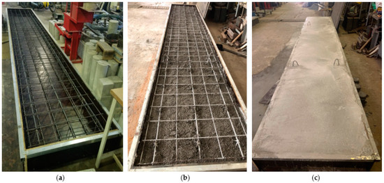 Fabrication of RC–UHPC composite specimen: (a) installation of reinforcement diaphragm into formworks; (b) after pouring EPS concrete layer; (c) after pouring NC layer.