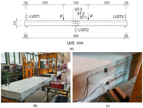 The bending behavior of the specimens was investigated by a four-point bending test under monotonic loading. The 6200 mm length specimen was placed on two simple supports with a clear span of 6000 mm; one end is hinged support and the other end is roller support with a distance of 100 mm from the edges of the test specimen. Two symmetrical concentrated loads at a distance of 2250 mm from the nearest support were applied to the test specimens through two steel spreader beams placed above to distribute the load to the test specimens, leading to the length of a maximum bending moment of 1500 mm. The loads were generated by a servo-hydraulic actuator with the maximal measuring range of 1000 kN. During the experiment, the applied load was measured by a load cell. The mid-span vertical displacement at each applied load level was measured by installing three linear variable displacement transducers (LVDTs). Two displacement transducers (LVDT1 and LVDT3) were attached to the supports, while the LVDT2 was installed at the mid-span of the specimen. The mid-span vertical displacement value is determined by δ = δ2 − 0.5 (δ1 + δ3), where δ1, δ2, and δ3 are the values measured from LVDT1, LVDT2, and LVDT3, respectively. Three electronic strain gauges ST-1, ST-2, and ST-3 were also arranged at the middle of UHPC, EPS, and normal concrete layer, respectively, with the location at the mid-span of the specimen. The measurement data was automatically recorded via a computer and a data logger which are connected to all LVDTs and electronic strain gauges. The testing arrangement and measuring equipment installation are shown in Figure 4.