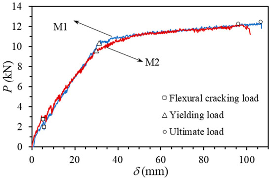 Figure 6 shows the applied load versus mid-span deflection relationships for both specimens, M1 and M2. In this figure, the flexural cracking, yielding, and ultimate points are also plotted, while the corresponding load values at these stages are listed in Table 5. As can be seen in Figure 6, the load–deflection curves of the two specimens display the same pattern. A linear relationship is observed before the crack occurs and the curves almost keep linear after that, with only a slight decrease in stiffness. When the longitudinal reinforcement yields, the stiffness of both specimens drops with a long ductile plateau stage before failure. The high ductility of specimens exhibited over the long ductile plateau stage in the case of a rather low longitudinal reinforcement ratio of 0.24% is attributed to the UHPC layer as indicated in literature [30].
