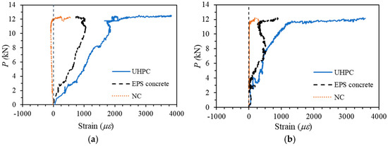 The relationships between the applied load and strain at the middle of each concrete layer at the mid-span section of specimens M1 and M2 are shown in Figure 7, in which the positive value denotes the tensile strain, while the negative value characterizes the compressive strain. As seen in this figure, the measured results have some abnormality; it is possible that the strain gauges are only installed on one side of the test specimens, resulting in uncertain measurement results. However, the similar results of the tensile strain at the middle of the UHPC layer from two specimens indicate that the measured strain from ST-3 may be reliable. Based on these measured results, the large tensile strain in the middle of the UHPC layer of about 4000 με demonstrates, once again, the effect of this layer on the ductility of the RC–UHPC composite slabs.