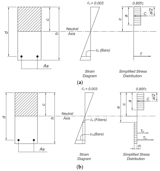 In Equation (2), a is the depth of the rectangular stress block that can be determined as a = β1c, where β1 is the stress block parameter and c is the neutral axis depth. For compressive strength of concrete between 17 and 28 MPa, β1 = 0.85, β1 shall be reduced linearly with a rate of 0.05 for every 7 MPa of compressive strength of concrete above 28 MPa, and the smallest value of β1 is 0.65. As can be seen in this equation and Figure 8, the ACI 318 design code [31] neglects the capacity of concrete in the tensile zone. However, for a steel fiber reinforced concrete section or composite section with a layer of steel fiber concrete in the tensile zone, the effect of steel fiber should be considered. For flexural strength of the steel fiber-reinforced concrete section, the ACI 544.4R code [32] adopts the strain diagram and simplified stress distribution as presented in Figure 8b and provides the flexural strength equations as follows:
