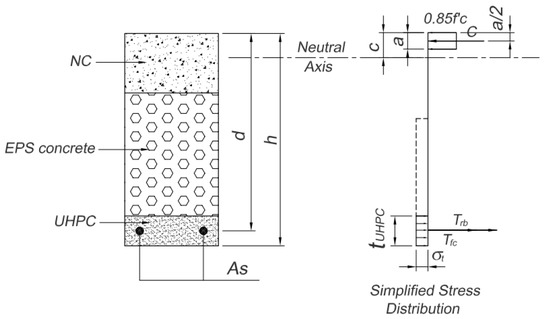 With the RC–UHPC composite slab proposed in this study, the thickness of normal concrete is always designed to adequately carry the compressive force when the cross-section is in the limit state. The effect of EPS concrete on the flexural strength of the section can be neglected due to its very low strength in both compression and tension. Therefore, if the tensile strength of the UHPC layer is not taken into account, the flexural strength of the composite section can be calculated as the normal reinforced concrete section according to ACI 318 [31] by using Equation (2). In case the effect of steel fiber in the tensile zone is considered, meaning that the tensile strength of the UHPC layer is taken into account, the stress distribution on the RC–UHPC composite section can be simplified as shown in Figure 9. In this model, the tensile stress is uniformly distributed in the whole thickness of the UHPC layer (tUHPC) with the value of σt as in Equation (4) if tUHPC ≤ e, where e is determined according to ACI 544.4R [32], considering the entire tension zone of the section as UHPC. In the opposite case, tUHPC > e, the stress distribution in Figure 8b is adopted.
