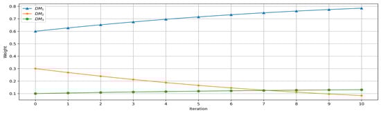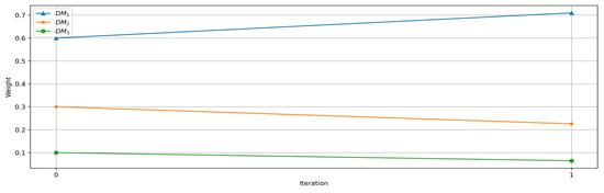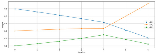 The order of changing the weights of experts is shown in Figure 1. The preference of (expert) decision makers compared to each other remains unchanged until the fourth step. After that, the algorithm continues by shifting the weight prioritization of the first decision maker with that of the second one. However, the total weight of the decision makers in each iteration is always equal to one, and this was always maintained in all iterations. These conditions are consistent with the results obtained by Cheng in [36].