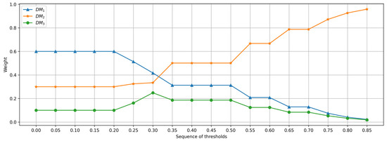 In order to investigate the effect of different thresholds on the weight of decision makers, we ran the algorithm based on a sequence of thresholds. We displayed the results in Figure 2. After TH = 0.5, the weight of the second decision maker increases. In contrast, the importance of the first and third decision makers decreases almost equally until they reach nearly the same weight. The obtained results are consistent with the characteristics of autocratic decision making mentioned by Caillier [37].