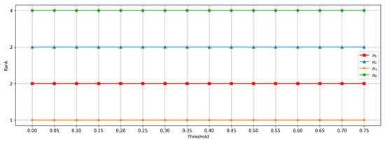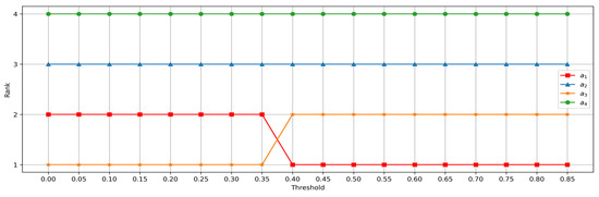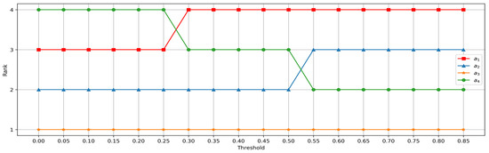 Furthermore, the process of changing the ranking of different alternatives based on different thresholds in both strategies is illustrated in Figure 6 and Figure 7.