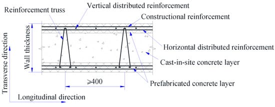 A superimposed slab shear wall is a kind of sandwich structure made of two layers of prefabricated concrete panels on both sides and one layer of cast-in-site concrete in the core, as shown in Figure 1. It has been broadly applied in the building industry recently due to its advantages of industrialized fabrication and relatively preferable integrity [1].