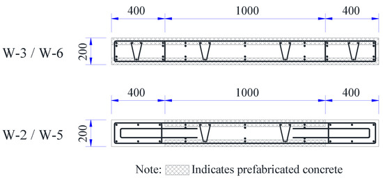 Table 1 summarizes the calculation results of ultimate shear strength of the combined interface utilizing the methods mentioned previously. In the premise of zero normal stress, supposing a roughness of 6 mm in the rough interface and 0 mm in the smooth interface, the shear capacity of the combined interface can be calculated by using the product of shear strength and interface area. From Lian [8], specimens W2 and W5 are cast-in-site superimposed slab shear walls, and specimens W3 and W6 are prefabricated superimposed slab shear walls. Among them, W2 and W3 are in an axial compression ratio of 0.1, and W5 and W6 have an axial compression ratio of 0. Their rebar details are illustrated in Figure 2.