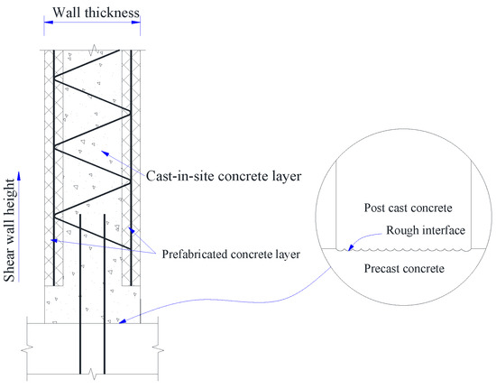 The connecting details of the reinforcement directly determine the shear capacity of the horizontal connection. Magana R.A. [28] proposes a connection method using sleeve grouting. Soudki et al. [29] proposes a connection method using various forms of mild steel (welded angle steel, sleeve, steel tube, bolt, etc.). JGJ1-2014 [30] provides a connection method by using welded rebar and cast-in-site pins. The connection details of the interface also contribute to the shear capacity of the horizontal connection. Commonly used prefabricated shear walls have dentiform or rough ground interfaces. A grouting and caulking procedure at the corresponding bottom rough face is conducted after the in-site installation. Figure 3 illustrates the typical reinforcement detail of a superimposed slab shear wall and its rough concrete interface.