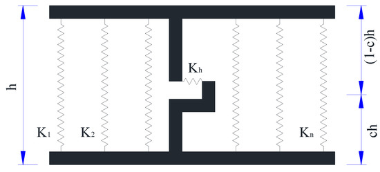 Kabeyasawa [41] proposes a macro-model with three vertical line elements. It can simulate the shift of the neutral axis of a shear wall after stepping into the non-linear stage. However, challenging problems still exist when it comes to determining the bending spring stiffness and the deformation compatibility between the bending spring and the side column. Vulano [42] proposes a vertical multi spring model. It simulates axial stiffness and bending stiffness with multiple vertical springs and shear stiffness with one horizontal spring. Not only can it consider the shift of the neutral axis, but also the comprehensive combination of restoring force models from multiple materials. In addition, the impact on strength and stiffness from axial load variation can also be simulated. Figure 6 gives the illustration of this model in which Kh is the stiffness of the horizontal spring, K1, K2 and Kn are the stiffnesses of the vertical springs, h is the height of the wall element and ch is the height of the horizontal shear spring.