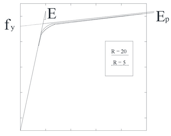 Vertical springs can be simulated by using the Truss element with specified fiber properties over the cross-section. The fibers consist of rebar fibers and concrete fibers; each has a diversified constitution provided by OpenSEES. In the cyclic reverse loading process, the cracking effect of the cross-section (which can be modeled using Concrete06 in OpenSEES) can increase energy dissipation and decrease the pinch effect, as shown in Figure 7. As for the rebar fiber, Steel02 in OpenSEES can better simulate the Bauschinger effect, as shown in Figure 8, where fy is the yield strength of the rebar, E is the initial elastic module, Ep is the plastic hardening module and R is the parameter influencing the shape of the curve.
