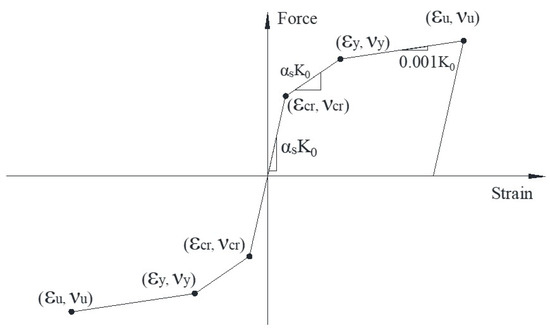The properties of shear springs in the model are assigned by the Hysteretic material in OpenSEES, as shown in Figure 9. The parameters of this material can be determined by using two methods. One is the empirical formula proposed by Hirosawa [43] from many shear wall tests. The other is the amended inclined compression field theory. In this paper, Hirosawa’s empirical formula was chosen.