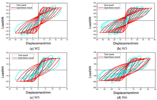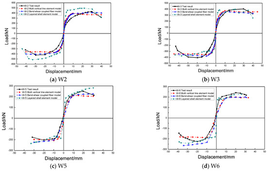 The test result and the simulated result for W2 were 429 kN and 406.96 kN, respectively, with an error of 5.1%. The test result and the simulated result for W3 were 412 kN and 371.81 kN, respectively, with an error of 9.7%. The simulated shear wall using bend–shear coupled fiber model under an axial compression ratio of 0.1 had an error of less than 10% compared with test results. The test result and the simulated result of W5 were 239 kN and 226.29 kN, respectively, with an error of 5.7%. The test result and the simulated result of W6 were 239 kN and 203.53 kN, respectively, with an error of 14.8%. Table 4 lists a comparison of the peak points of the load–displacement curves based on the bend–shear coupled fiber model for more intuitive analysis. The simulated shear wall utilizing the bend–shear coupled fiber model under an axial compression ratio of zero had an error less than 15% compared with test results. Compared with the macro-model with the vertical multi-line, the results generated using the bend–shear coupled fiber macro-model show higher consistency of hysteretic behavior for the test results and simulated results.