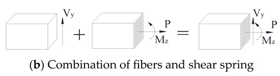 Shear force cannot be considered by the fiber element due to the lack of shear stiffness. To consider the shear effect, the section aggregator command in OpenSEES makes the shear constitutive able to be assembled in the fibrous section, as shown in Figure 11. This command was used to construct a section aggregator object, which aggregates groups of previously defined uniaxial material objects into a single-section force–deformation model. Each uniaxial material object represents a section’s force–deformation response for a particular section’s degrees of freedom. There was no interaction between responses in different degree-of-freedom directions. In this paper, Hirosawa’s empirical formula [43] was selected to define the shear constitutive, which is shown in Figure 9.