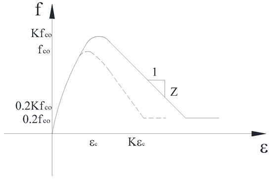 Concrete01 was selected to simulate concrete, and its constitutive model is illustrated in Figure 12. In this figure, K indicates the concrete strength enhancement factor, Z indicates the slope of strain softening, fco indicates the cube compressive strength and εc indicates the concrete compressive strain at the peak loading. Its compressive backbone curve was from the amended Kent–Park model without the consideration of the action of the tensile concrete. The three stages of the backbone curve are described as the ascend stage, descent stage and platform stage. Meanwhile, Steel02 was selected to simulate rebar, as shown in Figure 7.