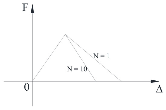 A more precise meshing approach ends up with faster declination in its load displacement curve if an identical cracking and softening stress–strain curve is utilized for all elements in the concrete. This phenomenon is called the fracture size effect, as shown in Figure 15, where N stands for the number of elements. To deal with this problem, a generalized method is to use the crack band model to adjust the softening stage of the concrete. Herein, the stress–strain curve is replaced with a crack width–stress curve, as shown in Figure 16, and the area contained by the curve is described as fracture energy.