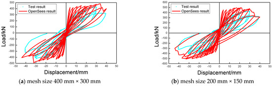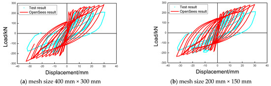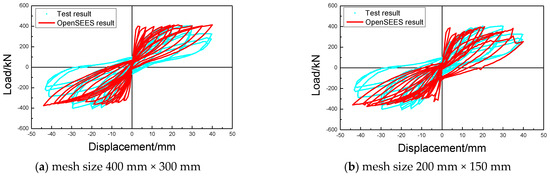 Given the mesh size of 200 mm × 150 mm, the simulated result for W2 is 494.8 kN with an error of 15.3%. The simulated result for W3 is 398.2 kN with an error of 3.3%. The simulated result for W5 is 283.3 kN with an error of 18.1%. The simulated result for W6 is 232.4 kN with an error of 2.7%. Compared with the results from the mesh size of 400 mm × 300 mm, the mesh size of 200 mm × 150 mm gave an equal effectiveness of predicting ultimate strength, and it performed better in evaluating hysteretic behavior. Table 5 lists a comparison of the peak points of the load–displacement curves based on the micro-model for more intuitive analysis. Under cyclic loading, simulated unloading stiffness and reloading stiffness were in close consensus with the test results.