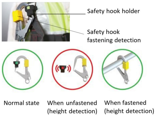 | Safety hook fastening detection | It is a system that determines whether or not a worker is engaged with a safety hook when working in high places, and provides notification through sound and platform. Through the web/app, an administrator can check whether the safety hook is fastened in real time. It does not require an independent safety hook, but only requires a dedicated piece of hardware applied to the existing safety hook. | ![]() |