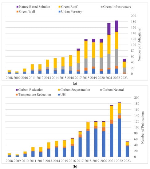 The research articles considered were initially extracted from the SCOPUS database over the last 15 years (2008–2023) based on keywords or a combination of keywords, as shown in Table 1. Additionally, another database, WoS, was also considered, but similar results to those from the SCOPUS database were generated. These selection criteria were applied due to the fact that most of the pertinent research articles were published post-2008. However, papers from other years that were mentioned in the articles reviewed were also considered during the review process. The terms, ‘carbon reduction’, ‘carbon sequestration’, ‘carbon neutral’, and ‘temperature reduction’, ‘urban heat island (UHI) effect’ are, respectively, directly and indirectly associated with CO2 emissions. Other keywords used include those describing different types of NBS and the different scales of application of such solutions. In total, 1188 papers were found based on the previously mentioned keywords, as shown in Figure 1. According to statistical data, green roofs have received more attention than other types of NBS (Figure 1a). While most studies have focused on investigating the benefits of NBS in mitigating the UHI effect, the number of papers related to carbon sequestration has increased considerably in recent years.