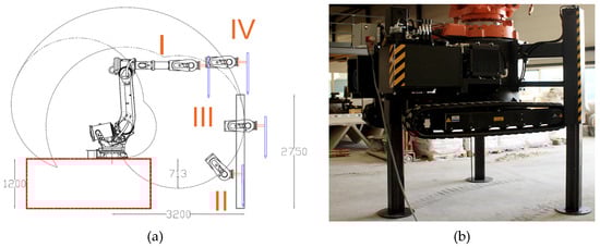 To take advantage of the maximum performance of the robot’s reach, the tool shown in Figure 5a was considered. This configuration can be better appreciated in Figure 6a. In this figure, the movement that the robotic arm performs concerning the extrusion to build the concrete wall is shown graphically, wherein (I) is the initial position of the robotic arm before the extrusion; (II) is the robotic arm’s reach at the beginning of the extrusion; (III) is the robotic arm’s reach in the intermediate zone of the extrusion; and (IV) is the final robotic arm’s reach at the end of the extrusion. In addition, it should be noted that, if necessary, the chosen crawler vehicle could raise its height using hydraulic supports, as shown in Figure 6b.