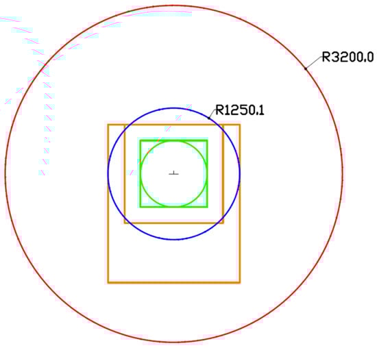Therefore, keeping in mind the robot’s reach, it was decided to operate outside the edges of the tracked vehicle, i.e., in a radius between 1250 mm and 3200 mm. The abovementioned range can be seen in Figure 7, where the blue circle represents the minimum range, and the red circle represents the maximum range in millimeters.
