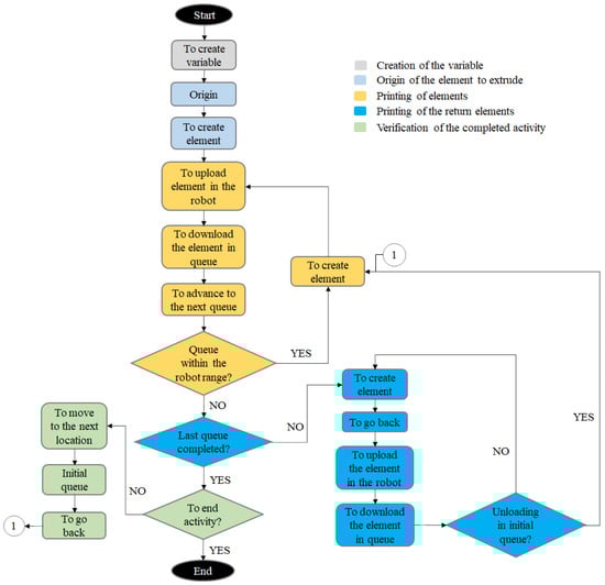 Then, in printing the next beads (one on another), the procedure of the previous stage is similar. The only difference is that, in this case, it is necessary to extrude in the opposite direction to the first bead because the robot is returning. This is performed once the last “Queue” of the printing sector is reached. Subsequently, a “Decide” code is inserted to check the number of elements in a specific queue that make up the height of the wall. If it reaches it, the robot must travel to the next position. Otherwise, if it does not reach it, the commands “Create Object”, “Load”, and “Custom” are entered. This last one is deployed so the robot decreases the correlative number of the “Queue”. Then, it reaches another “Decide” that checks if the first “Queue” of the extrusion site of such a location has been reached. If it has not, this last iteration is repeated; otherwise, it advances to the next position to continue with the next row. Later, the “Travel” and “Custom” commands are inserted in the completed activity verification. The abovementioned is carried out to travel to the next position, and the variable number is modified. In this way, the program can know in which “Queue” to start.