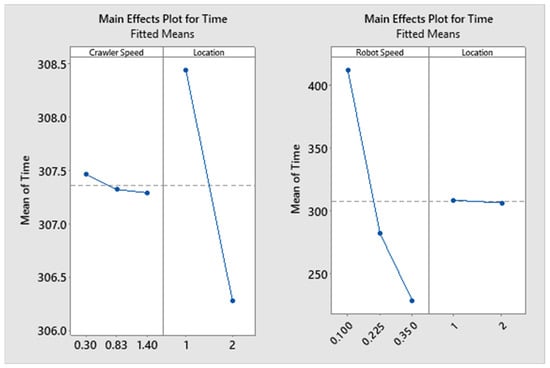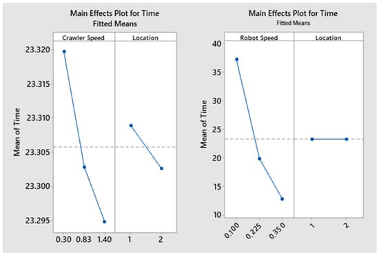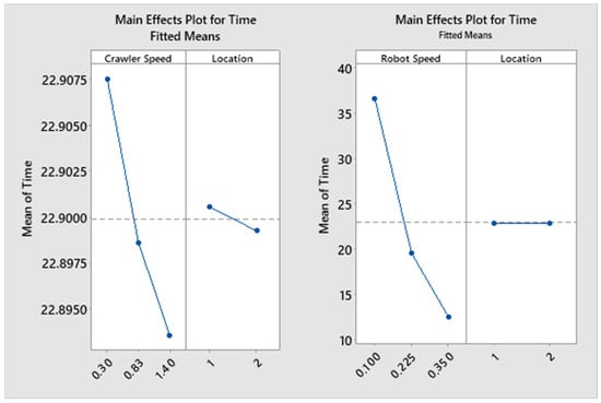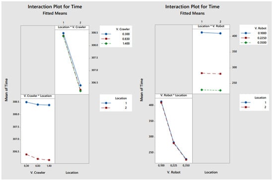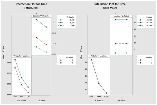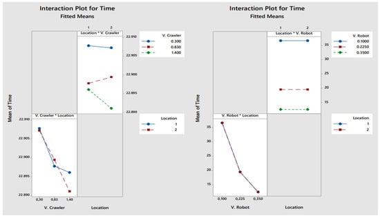 It was decided to consider 6 random values out of the 100 values obtained in FlexSimTM. To introduce them as replicates in the factorial analysis, and to study the effects caused by the different configurations, a factorial-type experimental design with three factors was performed. In the factorial analysis, to analyze the performance of a mobile robot that prints 3D concrete walls, the three factors used were robot extrusion speed, crawler displacement speed, and type of location of the mobile robot, denoted by the letters A, B, and C, respectively.