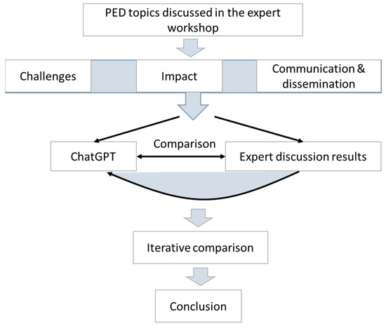 This study focused on three key topics of PEDs, in terms of challenges, impact and communication and dissemination. The discussion results of the participating experts were used to compare and validate the results generated from ChatGPT. Moreover, the experts’ opinions were further fed back into the ChatGPT, and an iterative comparison was then carried out. Figure 1 illustrates the basic research principle.