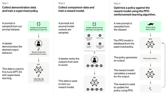 A model of reinforcement learning from human feedback (RLHF) [45,46] was trained by supervised fine-tuning, where human AI trainers provided conversations and they played both sides—the user and an AI assistant. The trainers had access to model-written suggestions to help them compose their responses. This new dialogue dataset was then integrated with the InstructGPT dataset, which had been transformed into a dialogue format. ChatGPT is built upon InstructGPT and uses a transformer architecture, which allows it to capture long-range dependencies in text and generate coherent responses that are contextually relevant. Our results in this paper are based on GPT-3.5, which finished training in early 2022 on an Azure AI supercomputing infrastructure. OpenAI employed a group of approximately 40 contractors who were attuned to the preferences of various demographic groups to generate demonstration and comparison data. Thus, the range of tasks covered by the inputs is significantly wider [47]. Specifically, as indicated in Figure 2, three steps were performed to train the model.