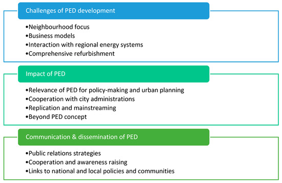 Existing urban neighborhoods, particularly in older and culturally protected parts of a city, can be seen as another key barrier for PED mainstreaming [10,11]. Overall, existing studies suggest that PEDs have the potential to balance and support the energy grid through local energy generation, the reduction of energy consumption and greenhouse gas emissions, and the promotion of sustainability in urban areas. However, the solutions to these different challenges require the integrated effort of all stakeholders, where the effective communication and dissemination are essential to ensure clear and comprehensive knowledge transfer from experts to the general public in the urban transition, including citizens, utility companies, real estate developers, banks, and other stakeholders. This entails the need for transparent and accessible information sharing to facilitate a widespread understanding between public officers and practitioners.
