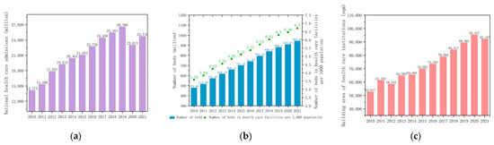 Changes in hospital admissions, number of beds, and floor space in the last decade. (compiled and drawn from the China Health Care Statistics Yearbook 2012–2022). (a) National healthcare admissions, (b) Number of beds and Number of beds in health care facilities per 1000 population, (c) Building areas of healthcare institutions.