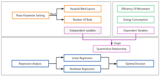 This study uses regression analysis to analyze the effect of changes in nursing unit size and floorplan on the efficiency of rounding and building energy consumption. First, a linear regression analysis was conducted on the dependent variables (rounding efficiency, building energy consumption) and the independent variables (floorplan, number of beds), respectively. Linear regression is an analytical method that uses linear regression equations to model the relationship between one or more independent and dependent variables [18] and measures the strength of the statistical relationship between the variables through the Pearson correlation coefficient. The Pearson correlation coefficient ρ is a linear correlation coefficient, and the value of ρ ranges from −1 to 1. When ρ > 0, it indicates a positive correlation between the two variables, i.e., the two variables change in the same direction; when ρ < 0, it indicates a negative correlation between the two variables, i.e., the two variables change in opposite directions. The closer ρ is to 1, the higher the correlation between the two variables, and the closer it is to 0, the lower the correlation between the two variables [19]. Second, for dependent and independent variables with poor linear correlation, curve estimation was performed using SPSS to determine and derive the best-fitting and significant data model by F-value and p-values to find the relationship between the independent and dependent variables. The regression analysis requires p-values of 0.05 or less, with a highly significant correlation if the p-values are less than 0.01. Additionally, the closer the F-value of the correlation is to 1, the smaller the difference, and the larger the F-value the larger the difference. For the F-value of the regression analysis, a larger value means that the regression analysis is statistically significant [20]. According to the results of the regression analysis obtained, it can be concluded that there is a relationship between the independent variables and the dependent variable, and the best floorplan and building size for rounding efficiency and building energy consumption is selected in terms of both functional space and building performance.