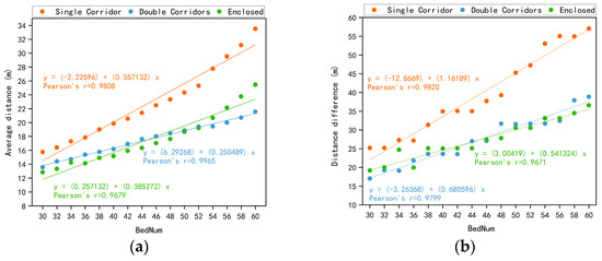 The results of the study show that: as can be seen in Figure 5, there is a significant linear relationship between the number of beds and the average distance and distance difference of the three floorplan types, and the Pearson correlation coefficient is close to 1, indicating a high correlation. (1) In the case of the same building size (i.e., the same number of beds), when the number of beds is less than 45, the three floorplan types are ranked from high to low in terms of the efficiency of nurse rounds as radial layout > double-corridor type > single-corridor. When the number of beds is greater than 45, the three floorplan types are ranked from highest to lowest in terms of rounding efficiency: double-corridor layout > radial layout > single-corridor layout. (2) When the number of beds is the same, the three floorplan types are ranked from highest to lowest in terms of balance: double-corridor layout, radial layout > single-corridor layout. The greatest increase in rounding efficiency was seen in the double-corridor floorplan (19.98) compared to the single corridor (33.52) at 60 beds, with a 40.39% increase in rounding efficiency.