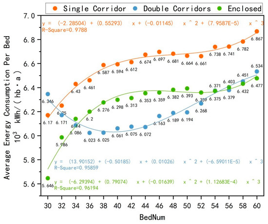 This section uses SPSS 26 software to perform curve estimation on the energy consumption simulation results of 48 building models for three floorplan types in ward buildings. First, the obtained data on average bed energy consumption were input into SPSS to build scatter plots of average bed energy consumption versus the number of beds for different planar forms, and curve estimation of linear, quadratic, and cubic was performed on them to obtain fitted plots and model summary of average bed energy consumption versus the number of beds for the single-corridor, double-corridor, and radial layout, respectively (Table 7).