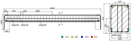 The reinforced concrete beam structure is selected from a typical protective fortification as the prototype for making original-size specimens. HRB400 is the abbreviation of hot-rolled ribbed reinforcement with a standard yield strength of 400 MPa; the diameter of longitudinal reinforcement is 22, 20, 14, and 12 mm, and diameter of the stirrup is 8 mm. Concrete strength grade is C30, and compressive strength of this concrete grade is a minimum of 30 MPa. The size and reinforcement structure of reinforced concrete beams is shown in Figure 1. Height and width of supports at both ends of the beam member are 500 and 380 mm. As shown in Figure 1, the actual reinforcement of the beam in the manufacturing process is consistent with the design drawing.