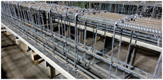 The cast in situ method is commonly used in projects and was adopted in this work for the fabrication of reinforced concrete beams. The wooden formwork was supported after the reinforcement binding was completed. Figure 2 illustrates the actual situation of reinforcement binding during the fabrication of beams. The cement grade of the test piece was P.O42.5. The aggregate size of the ready-mixed concrete was 5–31.5 mm. Concrete pressure test blocks were made and compressive strength tests were conducted under the same curing conditions while pouring reinforced concrete beam members. The compressive strength of the concrete reached 35 MPa, thereby meeting the strength requirements. The support of the reinforced concrete beam specimen extended into the support platform with a height of 1.1 m (blasting surface of the beam back was about 1.3 m from the ground) to realize the fixed support of the end of the beam. The overall layout is shown in Figure 3.