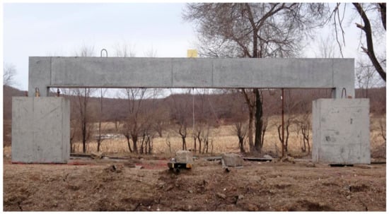 Many experimental studies on the blast response of reinforced concrete beam members have been performed because reinforced concrete beams are the main force transmitting elements in buildings. Tests are typically scaled-down, using small-size reinforced concrete beam members for the explosion damage test [2,3,4,5,6]; only a few tests use the original-size members for the explosion test because of the large cost of the original-size beam test and high requirements of the test site. Li et al. [2] and Lin et al. [3] used 1:6 downscaled reinforced concrete beam members for explosion tests to explore the differences in reinforced concrete damage at different explosion locations, explosive equivalents, and explosion distances. Yao et al. [5] conducted blast tests and numerical simulations for three downscaled sizes of reinforced concrete beams to examine the differences in the response of different-size members under close blast and proposed a scaling model that considers size effects. The mechanical property index represented by nominal strength decreases with the increase of structure size due to the evident size effect of the concrete structure, and the test results of the shrinkage test can only be indirectly applied to the original-size member. Zhang at al. [7] investigated the similarity law during the process of explosive penetration into concrete. However, using full-scale model tests is more convincing. Gomes et al. [8] carried out full-scaled concrete model tests to investigate a high-performance blast energy-absorbing system for building structures and it was found that there was a significant difference between near-field and far-field explosions in the tests.