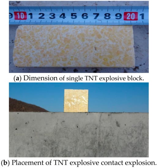 Explosives were placed in the middle of the beam span to realize the central contact explosion in the test. Relevant studies have shown that the damage index of the beam will reduce when explosives gradually move from the middle of the span to the end [1]. Only the mid-span contact explosion with maximum damage to the beam is considered in this study. Explosives are stacked using standard TNT explosive blocks. The mass and density of a single standard TNT explosive block with dimensions of 100 mm (long) × 50 mm (wide) × 25 mm (height) are 200 g and 1.6 g/cm3, respectively. TNT with a mass of 1, 2, 3, 4, and 6 kg was selected for the damaged test. The dimension of TNT is shown in Figure 4a. TNT is placed on the surface of the beam and in direct contact with the concrete, as shown in Figure 4b.