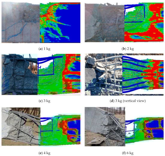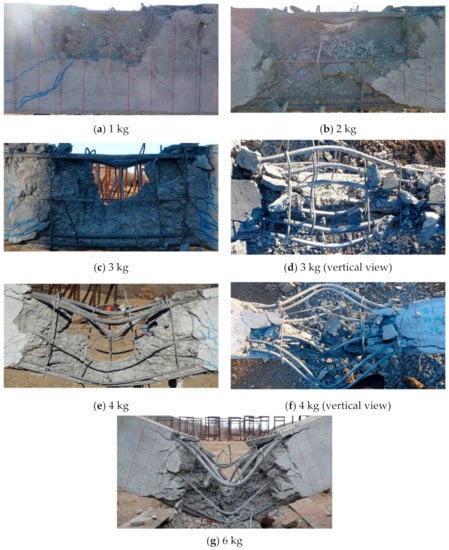 Figure 5 shows the failure states of the reinforced concrete beam side under TNT explosive contact explosions of 1, 2, 3, 4, and 6 kg. The pictures shown are taken after cleaning the broken concrete in the concrete damage area.